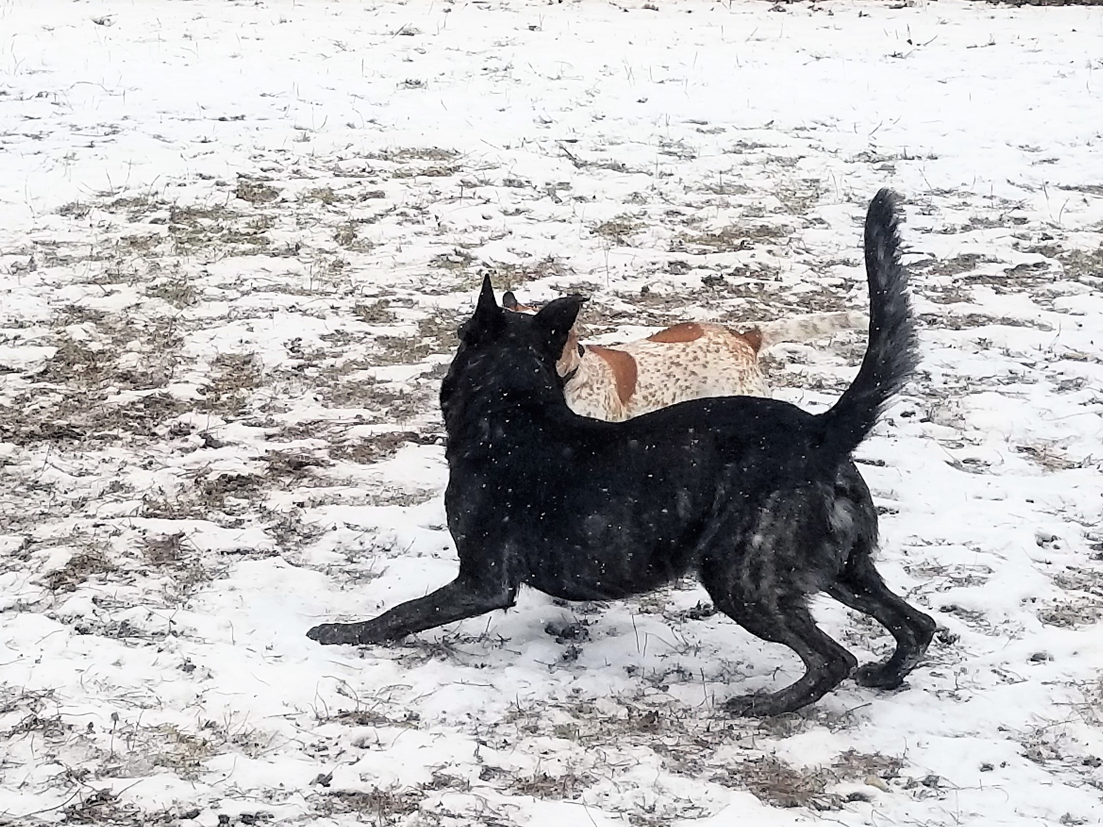 20171229_142757 ← Previous Next → These three photos show dogs engaged in appropriate greeting. In this one the larger dog does a play bow. He lowers his body in an attempt to engage the other dog.